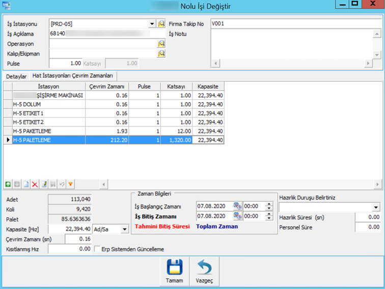 Örnek vermek gerekirse, bu görsel bir planlama ekran detay görseli ve burada hattın ekipmanları görülmekte. Doldurulmuş bir şişe, ürün çeşidine bağlı olarak buradaki gibi 12’li paketleniyor ve aynı şekilde 1320 adetle paketleniyor olabilir. Bu durumda 1 ürünün üretilme süresi üzerinden 12 ile çarpılarak paketleme operasyon hızı (1.93 sn), 1320 ile çarpılarak paketleme operasyon hızı (212 sn) elde edilebilmekte ve bunu MES Sistemi zaten otomatik gerçekleştirmektedir. Bu aslında programda sektörel bazda bir iş emri yönetim özelleştirmesidir.