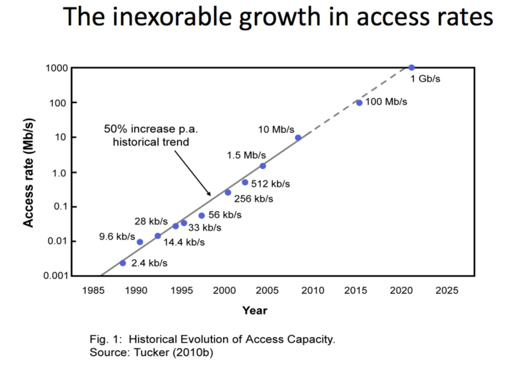 Grafik yıllara göre erişilebilen bant genişliğini gösteriyor. Lineer artış sürekli devam etmekte 15 yıl öncekinden 100 kat geniş bir bant genişliğine sahibiz.